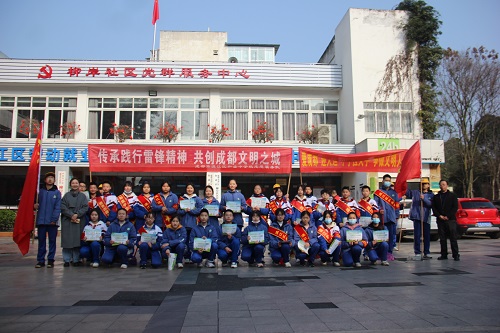 在第60个“学雷锋纪念日”即将到来之际,为进一步传承和弘扬新时代雷锋精神及社会主义核心价值观,培养青少年学生关爱他人、服务社会的优良品质,和盛中学分管德育副校长王斯壮、学生发展中心副主任张琪带领和盛中学党员志愿者、共青团员、少先队员及学生会成员代表共计30余人,深入社区开展以“传承践行雷锋精神 共创成都文明之城”为主题的志愿者服务暨“爱成都 迎大运”、“小手拉大手”宣传活动。