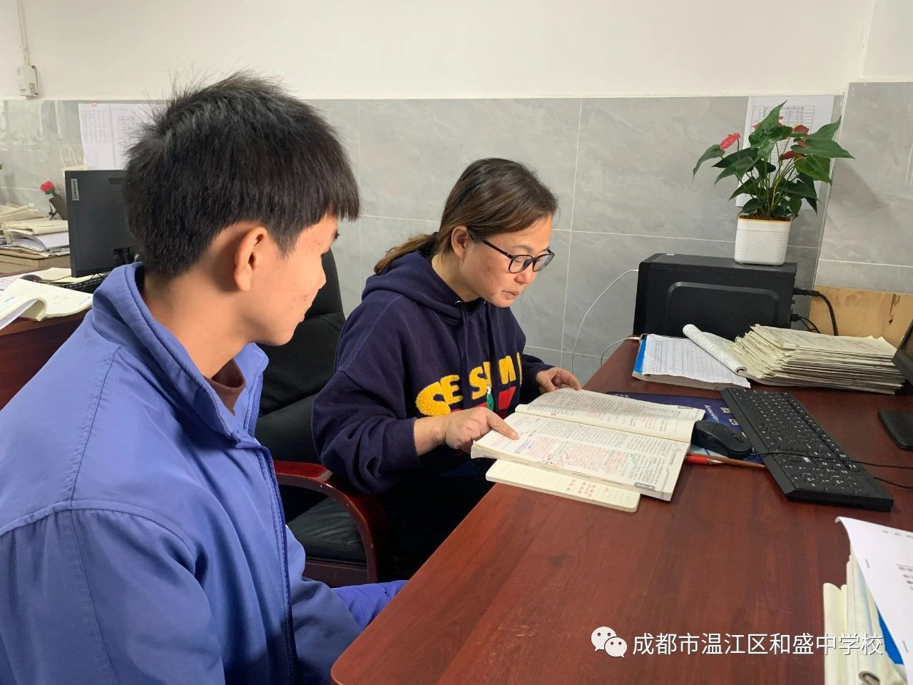 如今,胡老师在教师这个光辉的岗位上,在和盛中学这个温暖和谐的大家庭中,已扎实而无悔地走过了三十多个春秋,临近退休的她,依然毫不懈怠,一如既往地扎实工作,在黑板与讲台之间,恪尽职守,任劳任怨,始终热爱,始终坚守,浇花浇根,育人育心。