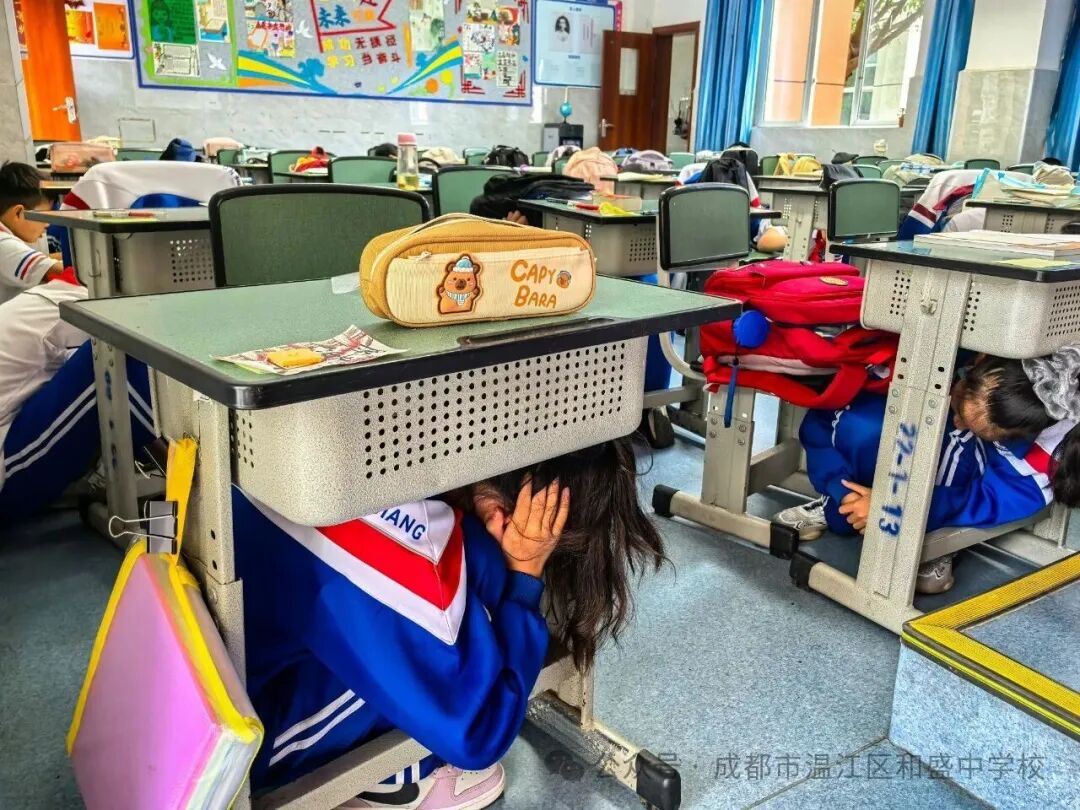 紧接着,“空袭警报”响起,鸣6秒停6秒,重复15遍,表明空袭已逼近。师生们迅速利用课桌等遮蔽物蹲下隐蔽,用书包护住头部,模拟真实空袭环境下的自我保护。学生们表现出高度的纪律性和自我保护意识,严格按照指导行动。