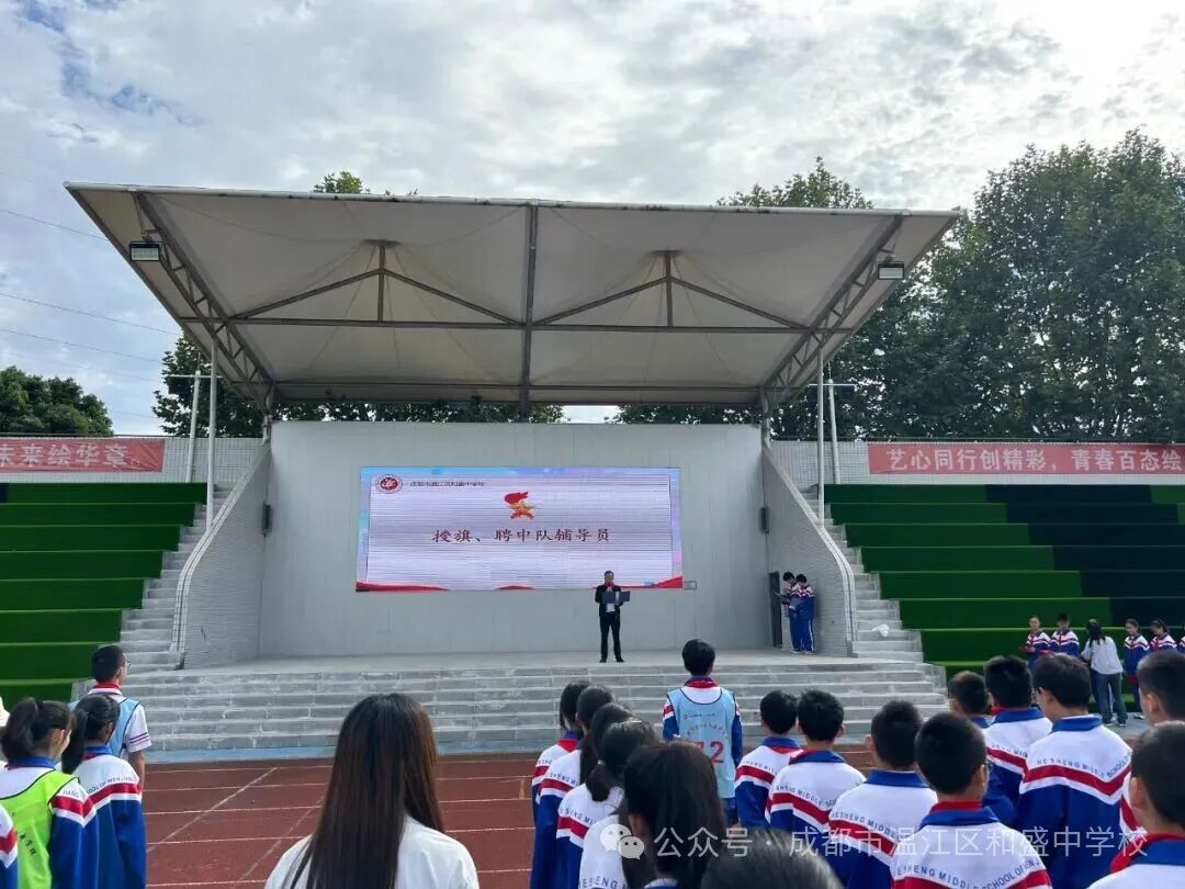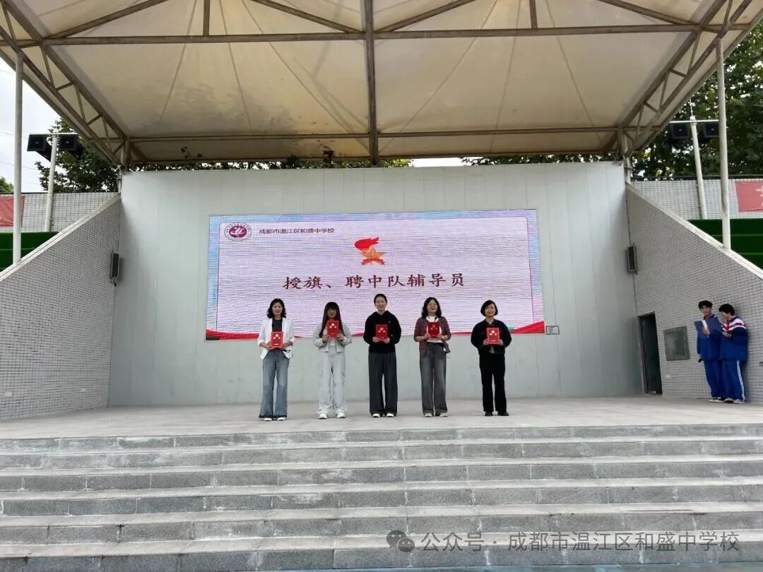 紧接着,和盛中学分管德育副校长王斯壮宣读七年级各中队成立及辅导员聘任决定,新中队正式宣告成立。学校党员教师代表为新建中队授旗,一面面队旗象征着光荣与责任的传递。学校党支部书记、少工委主任张校长为中队辅导员颁发聘书,各中队优秀少先队员代表为辅导员佩戴红领巾,场面温馨而感人。